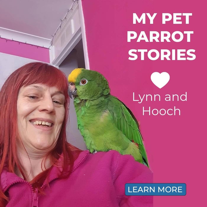 Welcome back to “My Pet Parrot Stories,” brought to you by Parrot Essentials! This month, we’re excited to share a captivating tale of companionship between Lynn Oldfield and her vivacious yellow-crowned Amazon pet parrot, Hooch. Hooch is a 15-year-old male yellow-crowned Amazon parrot named after the lemon-flavoured alcoholic drink in a green bottle due to the colouring of his plumage.